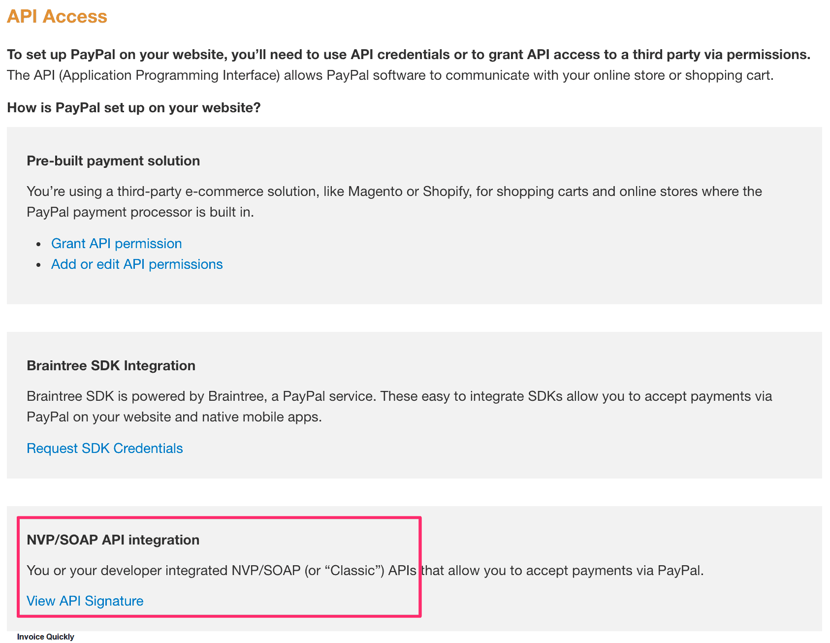 - Once on the API credentials page, click on the last option for NVP/SOAP API integration.