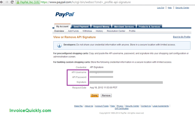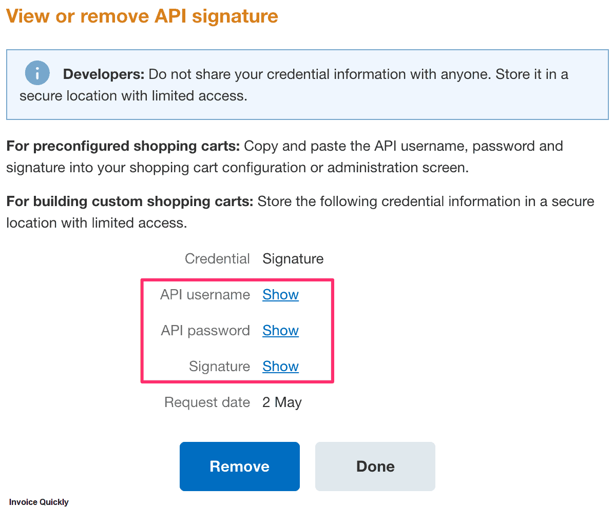 - Remember, API credentials are sensitive information. Store them securely and never share them with unauthorized people. In case you suspect they are compromised, immediately remove existing API signature and create a new one as shown above.